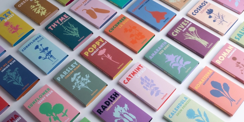 Herboo seed packets lined up in a row showing a range of flower, herb and vegetable varietiesCorporate Gifting with Seeds